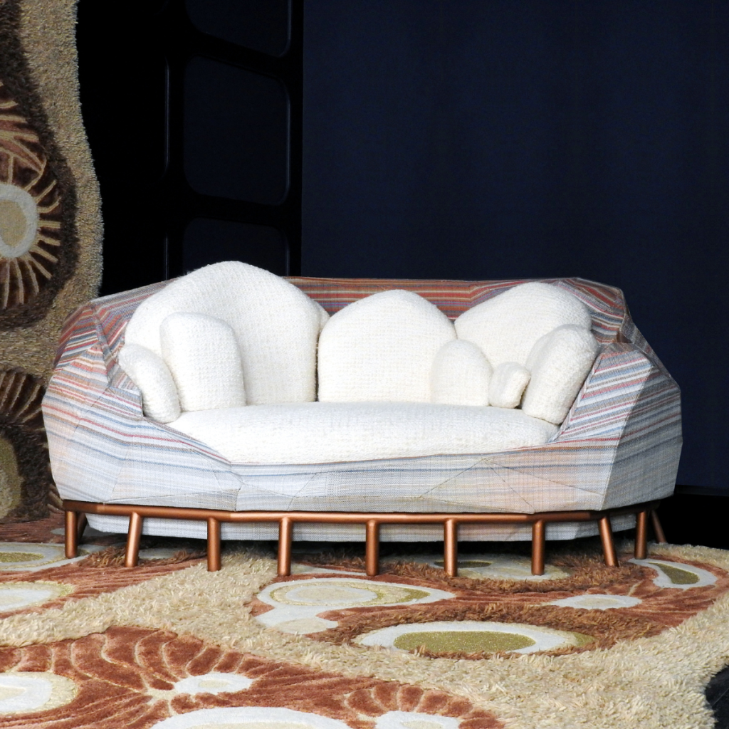 Les feuilles, les plantes, les arbres, les morceaux de bois, les rhizomes, la rocaille se transforment en tapis, en lampadaires, en fauteuils, en poufs qui, assemblés, forment des univers organiques : une alliance parfaite entre archaïque et extravagance douce ; une transcendance de la nature où l’artefact contemporain vient apporter son humble contribution pour une nécessaire reconnexion à nos émotions.